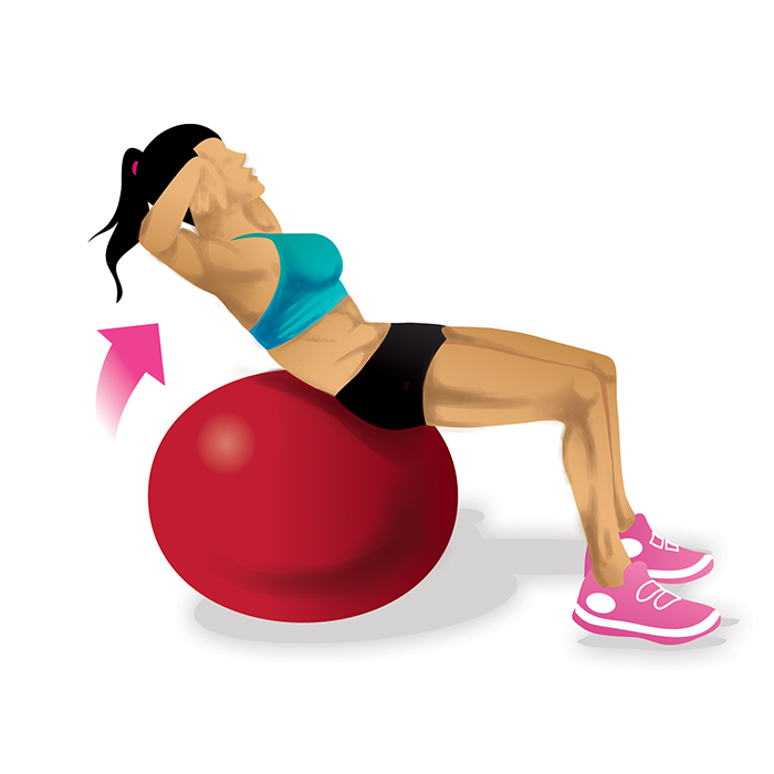 Startposition: Rückenlage auf dem Gymnastikball. Die Hände hinter den Kopf legen. (TIPP: Du kannst deine Hände auch nach vorne ausstrecken, um das Gleichgewicht besser zu halten.)