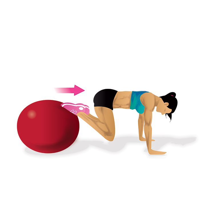 Startposition: Lege deine unteren Schienbeine auf einen Gymnastikball und nimm eine Liegestütz-Position ein, wobei deine Arme und Beine gestreckt sind.