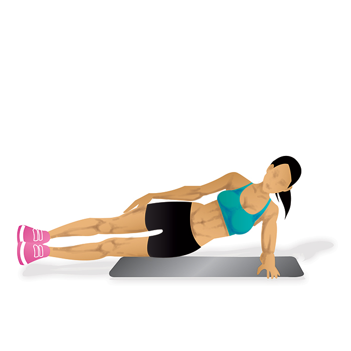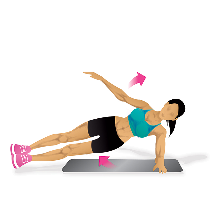 Startposition: Lege dich auf eine Seite und hebe deine Hüfte an, während du deinen Körper mit deinem Fuß und deinem Unterarm abstützt.